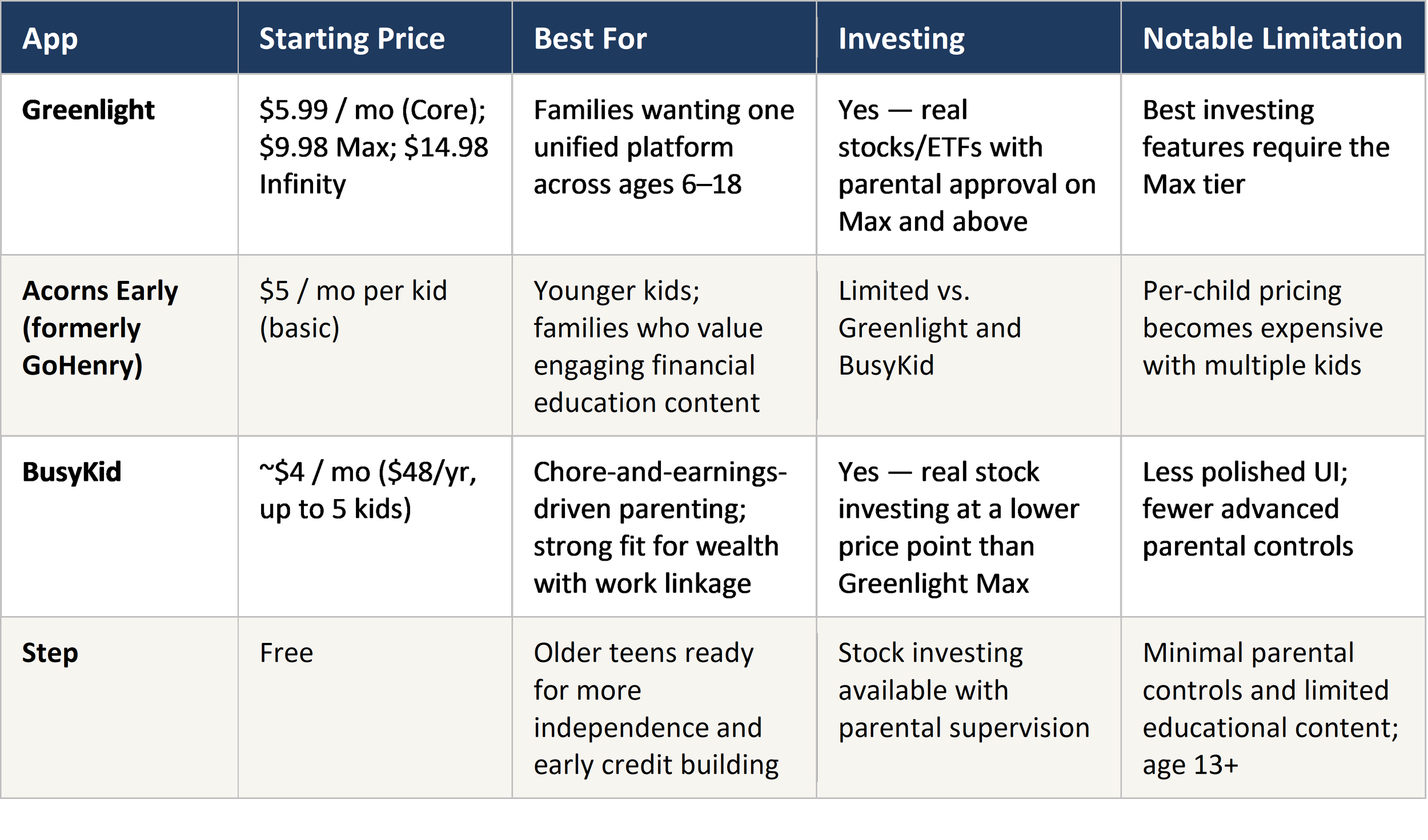 Greenlight, Acorns Early, BusyKid, and Step are all considered credible tools. For most HNW families with multiple kids, Greenlight Max is a strong starting point. It fits families who want one well-integrated platform. Its real investing feature is the key benefit. It is the highest-leverage teaching tool in this category.