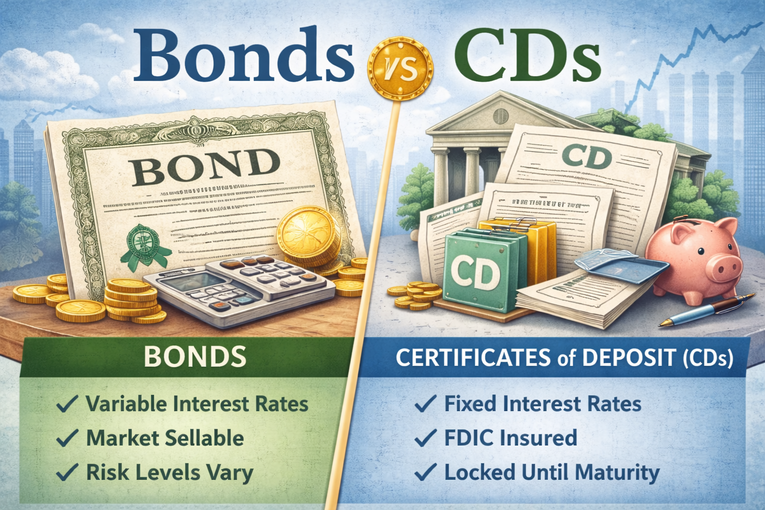 ● CDs offer low risk and FDIC insurance (within limits), but typically require you to hold funds until maturity unless you’re willing to sell early, potentially at a loss.